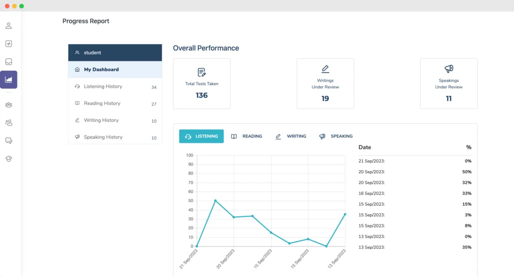 See all of your reading, listening, writing and speaking tests in one easy to read report. Dig deeper and to see where you need to concentrate your studies. Plus, get to see your individual writing and speaking grades and feedback from your trainer.
